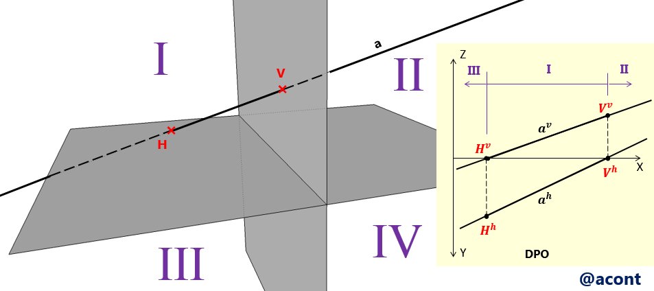 En la DPO los puntos de la recta “a” cuya cota y vuelo son positivos se encuentran en el primer cuadrante. Los puntos de dicha recta que tienen vuelo negativo y cota positiva están por detrás del plano vertical de proyección, es decir, el segundo cuadrante, puesto que esto ocurre a la derecha de la traza vertical “V” en la DPO. Finalmente, los puntos de la recta que se encuentren a la izquierda de la traza horizontal “H”, tienen cota negativa y vuelo positivo, indicando que la recta atraviesa el tercer cuadrante a lo largo de este sector de la misma.