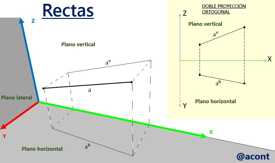 Una vez conocidas las proyecciones horizontal y vertical de dos puntos podemos obtener una recta. En su defecto basta con conocer un punto y una dirección específica. Existen varios tipos de rectas dependiendo de su dirección y posición en el espacio. Algunos de estos tipos de recta más allá de poseer alguna particularidad geométrica, poseen aplicaciones importantes en procedimientos para resolver problemas métricos, por lo que también estos tipos de recta pueden ser vistos como herramientas que deben de comprenderse para poder utilizarse con efectividad.