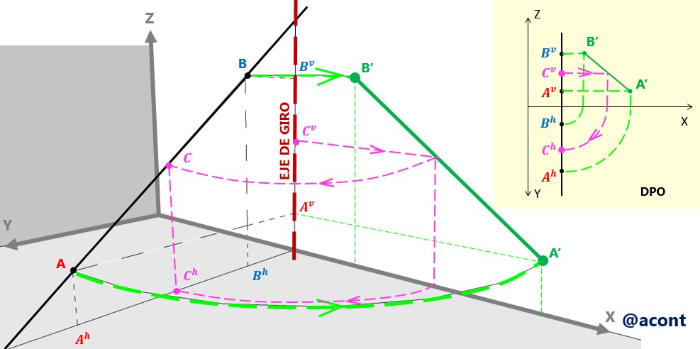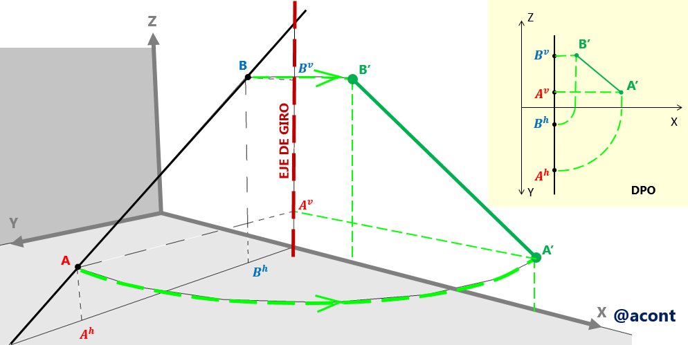 Cabe destacar que el “giro” de la recta de perfil pudo haberse efectuado alrededor de una recta de punta en el plano horizontal, el procedimiento sería similar solo que el movimiento se daría al revés. No necesariamente el ángulo de rotación debe de ser un ángulo recto y el eje de rotación tener vuelo o cota cero (Osers et al 2012). Esto último se refiere a problemas particulares de rectas de perfil.