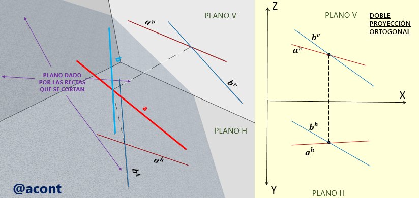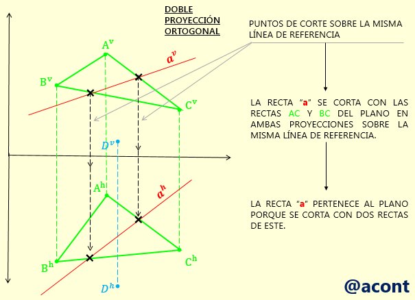 De las condiciones anteriores, sabemos que, si dos rectas se encuentran sobre el mismo plano, ambas deben de cortarse en algún punto para que sean coplanares. Entonces, para confirmar si la recta “a” se encuentra dentro del plano dado, esta debe de cortarse con mínimo dos rectas de este. De esta manera, en la DPO observamos que el punto de corte de la recta “a” con las rectas del plano se encuentra sobre la misma línea de referencia vertical, por lo que la recta “a” efectivamente se corta con dos rectas de dicho plano (Fig. N°6). Recordemos de la Parte III de esta serie de publicaciones que, si dos rectas no se cortan, el punto de corte en ambas proyecciones de la DPO no se encuentra sobre la misma línea de referencia vertical.