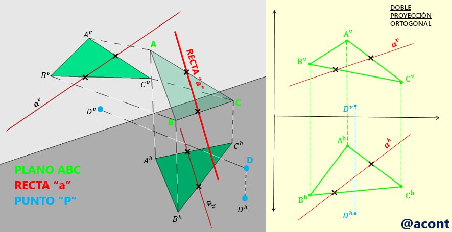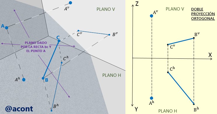 Supongamos que conocemos un plano dado por tres puntos “A”, “B” y “C”, una recta “a” y un punto adicional “D”. Esta situación se observa en la Fig. N°5, en la que se ha representado en el espacio y en doble proyección ortogonal el plano, la recta y el punto. La pregunta sería: ¿Cómo confirmamos que la recta “a” y el punto “D” se encuentran dentro del plano?