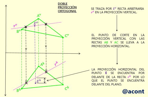 Si en vez de trazar una recta arbitraria por la proyección vertical del punto “E” se hubiera trazado en la proyección horizontal de este punto, encontraríamos que, en la proyección vertical, dicha recta se encuentra “por encima” de la proyección vertical de “E”, es decir, por encima del plano, tal como se observa en la Fig. N°8. En resumen, el punto “E” se encuentra detrás y por encima del plano dado.