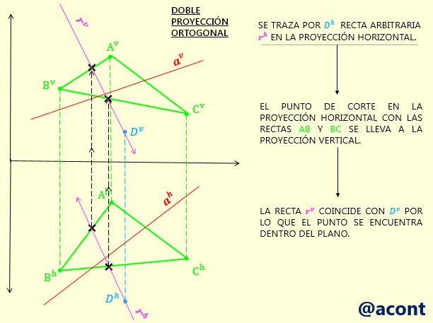 En el caso del punto “D”, la única forma de verificar que su ubicación está dentro del plano dado, es trazar por “D” una recta arbitraria que se encuentre dentro del mismo, es decir, nosotros la vamos a hacer pertenecer al plano. Para lograr esto, la recta debe cortarse con mínimo dos rectas de dicho plano, similar al caso anterior. En este caso, trazaremos una recta arbitraria “r” por “D” en su proyección horizontal que se corte con dos de las rectas del plano para así encontrar la proyección vertical de la recta arbitraria “r”. Si la proyección vertical de dicha recta arbitraria pasa por la proyección vertical del punto “D”, este punto estará dentro del plano (Fig. N°7). También se pudo haber trazado la recta arbitraria empezando por la proyección vertical.