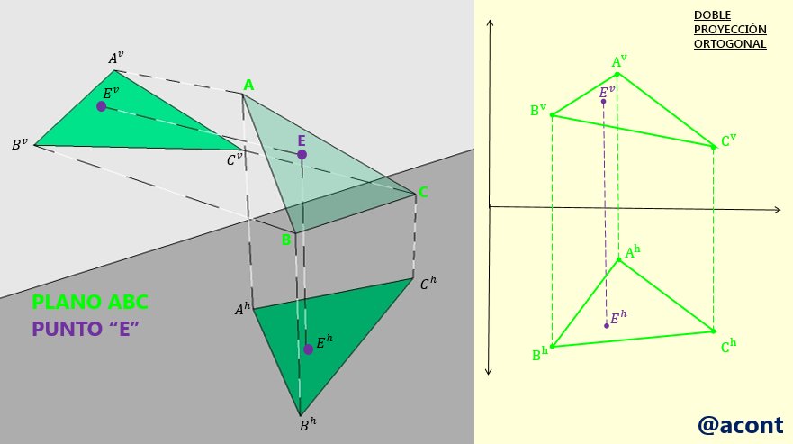 Esta vez, conocemos un punto “E” que no está dentro del plano (Fig. N°8). La pregunta que podemos hacernos es ¿Este punto está arriba o abajo, delante o detrás del plano?