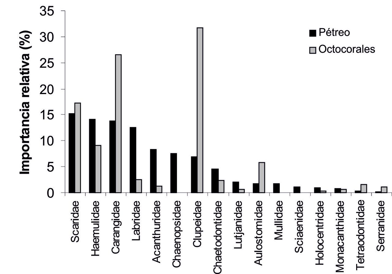 Las familias con mayor importancia numérica en el arrecife pétreo fueron Scaridae (15,22%), Haemulidae (14,18%), Carangidae (13,88%) y Labridae (12,59%); mientras que en los octocorales, las familias con mayor abundancia fueron Clupeidae (31,69%) Carangidae (26,56%), Scaridae (17,33%), Haemulidae (9,13%) y Aulostomidae (5,78%) (Fig. 4).