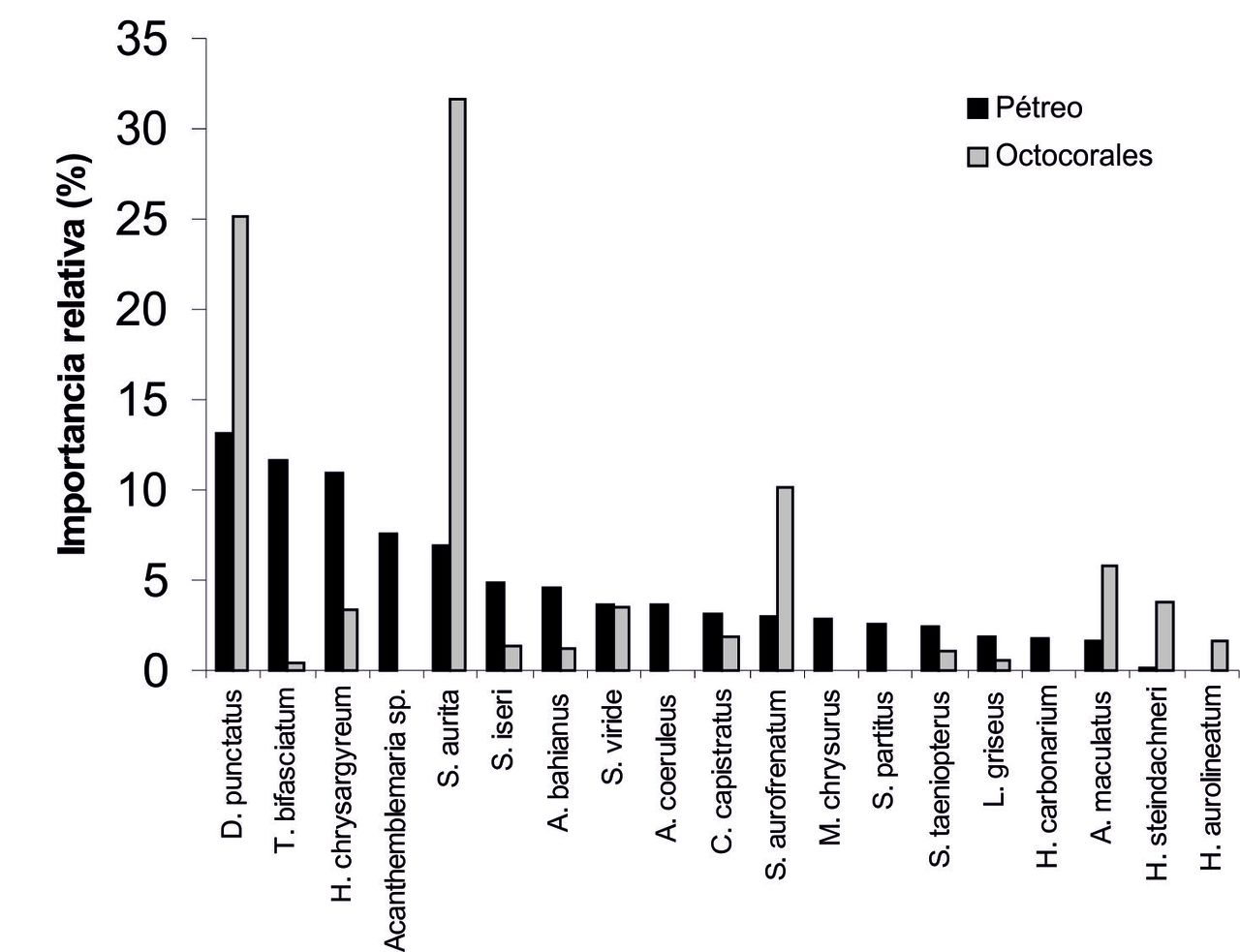Al analizar estos dos sistemas de sustratos, adyacentes pero estructuralmente distintos, se observa que el arrecife pétreo es más diverso y con mayor riqueza que el sector de octocorales. Esto pudiera estar determinado por la alta heterogeneidad estructural que ofrecen las grandes rocas con sus innumerables oquedades, generando una disponibilidad de refugio para los peces más elevada (Friedlander y Parrish, 1998; Syms y Jones, 2000) respecto al también heterogéneo, pero menos complejo, sistema de ramificaciones en los octocorales. Además, sobre los octocorales son limitados los epibiontes que se forman, debido a sus defensas químicas así como su superficie móvil y menos extensa. Estas características, en conjunto, traen como consecuencia una menor cantidad de alimento disponible y, por ende, un número más bajo de especies de peces asociadas. Por lo tanto, los recursos en los octocorales se encuentran más limitados, por lo que las presiones selectivas deberían ejercer una mayor fuerza competitiva, lo cual pudiera influir en una ocupación selectiva del espacio por especies apropiadamente adaptadas.