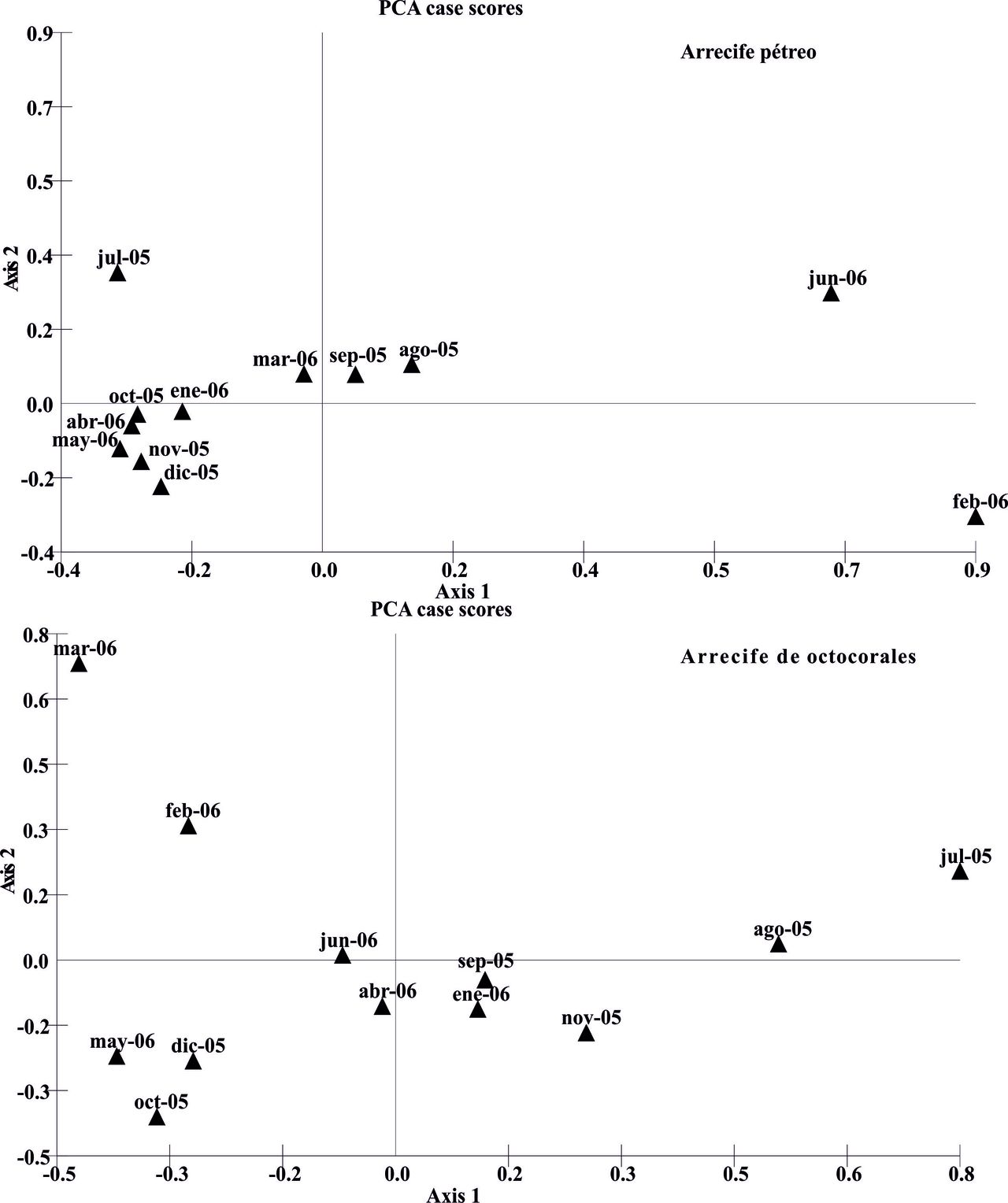 Los resultados del análisis de componentes principales indican una mayor dispersión de la abundancia mensual de las especies en el arrecife de octocorales respecto del pétreo (Figura 6). Tal situación pudiera estar reflejando que el ensamble de peces en los corales blandos es menos estable, con especies que fluctúan anualmente entre este sustrato y zonas foráneas. Esta hipótesis se refuerza cuando se observa la presencia de los taxa durante los meses de muestreo, ya que en los octocorales, la mayoría de las especies hacen un uso accidental del espacio (53,66%) o son accesorias (21,95%); y sólo una cuarta parte se presenta de manera constante (24,39%) (Figura 7). De las 41 especies presentes en este sustrato, sólo Aulostomus maculatus, Sparisoma aurofrenatum y Sparisoma viride; estuvieron en todos los meses de muestreo.