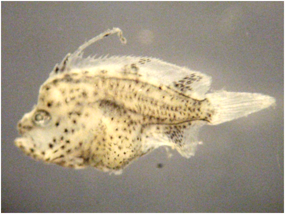 Figura 7. Fotografía de una larva (4,15mm de LE) de la especie Abudefduf saxatilis (Pomacentridae), que ya muestra aletas casi completamente desarrolladas, las cuales darán lugar a una capacidad natatoria mucho más activa.