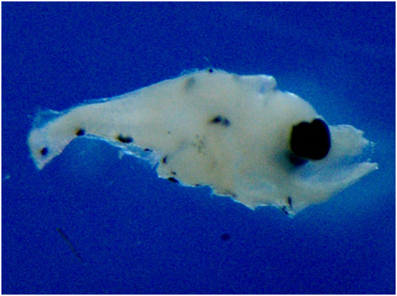 Figura 5. Imagen de una larva de la especie Achirus lineatus (Pleuronectiformes), con 2,75 mm de LE, en la cual se distingue un solo ojo en el lado izquierdo del cuerpo, característico de los peces pelágicos (el otro ojo se sitúa en el lado derecho).