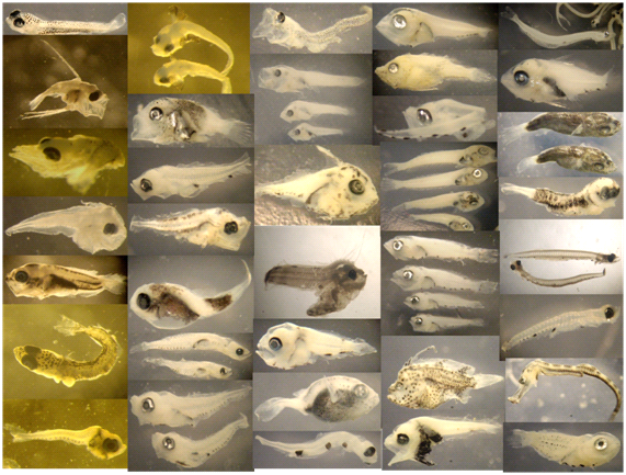 Figura 11. Collage de fotos de larvas de peces que muestra la diversidad de formas dentro del ictioplancton capturado en zonas de arrecifes del oriente venezolano