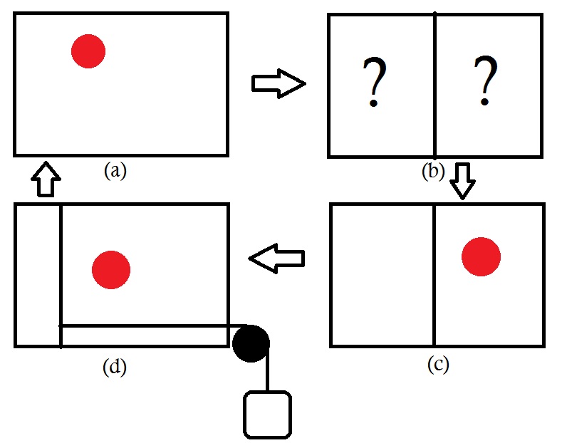 The engine consists of a single molecule as a working fluid and of course, there is a demon (a). The job of the demon is to figure out in which half of the box is the molecule located(b). Let's say the demon finds that the molecule is on the righthand side, now the demon quickly places a partition and attaches a piston on the righthand side(c). Due to the presence of molecule on the righthand side, the piston moves to the left and work is done on the load attached to the piston. Finally, the piston can be removed and the system is back to the original state(d). In this cyclic process, the engine extracts some heat energy and converts it to an equal amount of work (It can be shown that the amount of heat generated is kTln(2) ). Out of nowhere, the engine converted the thermal energy of the molecule into mechanical energy (work). The second law doesn't allow this, so one has to be wrong. Is it the second law or the Szilard's engine? You may argue that the work has to be done to insert and remove the piston. Yes, in practice work has to be done but in principle such processes can reversible and no entropy will be generated. The only option left to save the second law is again the measurement of the position of the molecule. Brillouin showed that entropy is generated to measure the position of the molecule via light signals [4]. Brillouin argued that the work generated by the engine is used to measure the position of the molecule and this is enough to save the second law. This turned out to false sigh the demon hasn't died yet. You may also wonder what's so special about the Szilard's engine? Technically, it's not much different than the original Maxwell's demon but the observations made by Szilard later turned out to be the foundation of information theory. The driving force behind the Szilard's engine is the information of the position of the molecule and the decision made by the demon is a binary operation. In a way, we can say that Szilard related information with the binary operation long before the existence of modern computers.