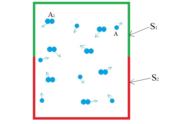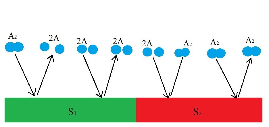 As you can see, the diatomic molecule is broken down and desorbed into two molecules of A (2A) by S1 but if two molecules of A comes in contact with S1, nothing happens. Meanwhile, the S2 surface is chosen such that it combines and desorbs two molecules of A (2A) into a diatomic molecule(A2) The dynamic process of disassociation and association of molecules maintains a chemical equilibrium: