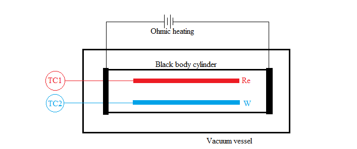 Rhenium(Re) and Tungsten(W) coated thermocouples were used as surfaces S1 and S2 respectively. They were then connected to two thermocouple gauses TC1 and TC2 to measure the temperature. To create blackbody condition, the core cylinder, on which the metals were placed, was wrapped with foils of either tungsten or rhenium. The core cylinder was continuously heated to maintain an isothermal condition inside it and then placed inside a vacuum sealed vessel to prevent heat losses. Hydrogen gas (H2) was used as the working gas because of its ability to react with high-temperature refractory metals. Instead of just measuring the temperature difference for hydrogen gas, the experiment was conducted for Helium too. According to the second law of thermodynamics, the temperature difference both gases have to be zero-i.e.,