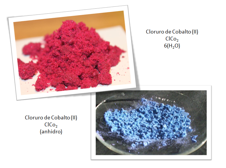 Otro ejemplo es el caso del ClCo2 (Cloruro de Cobalto (II) o cloruro cobaltoso), donde se observa en forma anhidro, libre de humedad o moléculas de agua de color azul, mientras que en forma hidratada adquiere un color rosa. Este compuesto es altamente higroscópico por lo que es muy común observarlo de color rosa en su forma hidratada, por lo que debe someterse a un tratamiento de temperatura cercana a 100 ºC para sacarle la humedad y obtenerlo de color azul en su forma anhidra. La estructura atómica de estas 2 formas del ClCo2 tiene que ver con los ligandos de Cl y Co, además de las moléculas de agua presentes en la forma hidratada, dando origen a la configuración de los niveles energéticos y a la sensación de colores que observamos en este compuesto. En el caso del ClCo2 anhidro, se absorberá en la región del espectro electromagnético menos energético, cerca de la región naranja, por lo que se transmitirá o reflejará su color complementario que es el azul, precisamente el color que ven nuestros ojos (sensación visual). En la forma hidratada se absorbe a energía más alta, cerca del verde y la sensación visual corresponde a su color complementario el rosa característico del ClCo2 6(H2O).