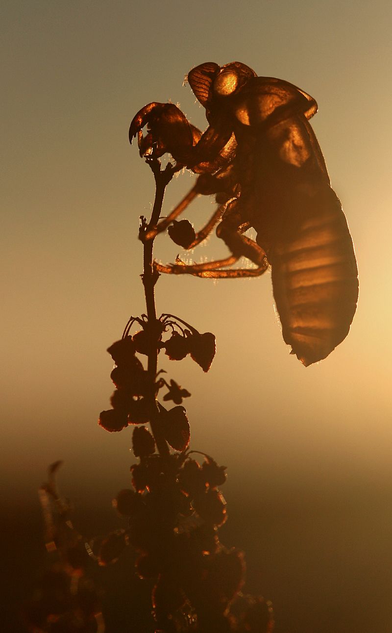 ... the cicada larvae has changed her appearance a few hours earlier, in the dark near dawn ...