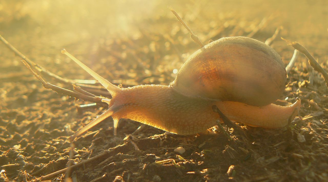 ... a snail is hurrying across the small dusty road, seeking shelter before the day becomes really hot ... it has spent the fresh, humid night slowly feeding on the open, but now its time to put in use some snail speed, the sun is still emitting a gentle yellow gold ... but soon there will be white heat in the summer air ...