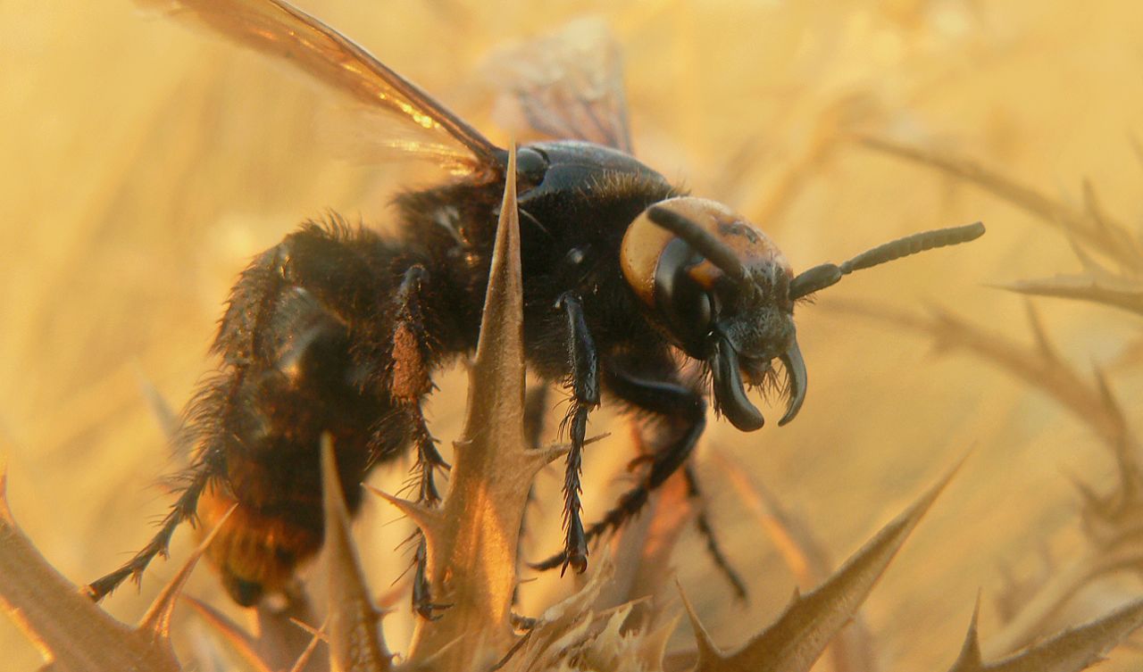 ... a mammoth wasp ... this one I photographed in the evening ... I remember the occasion ... there was a party on the beach ... and while wandering around with a joint, I came across the wasp, it eas very calm, preparing for the night rest and so I had a good opportunity for a shot ...