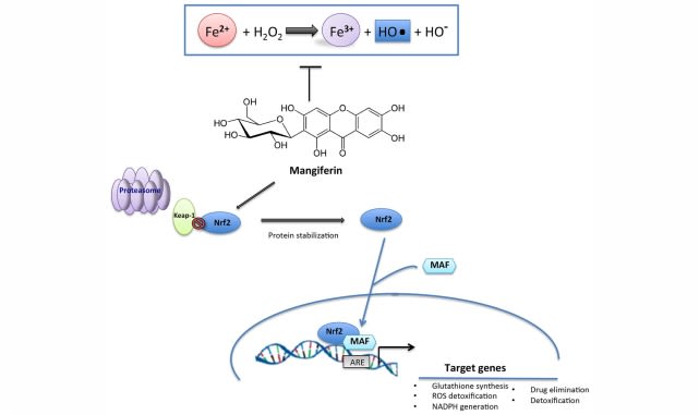 Existe evidencia convincente que ha demostrado que la mangiferina muestra un eficiente potencial quelante de hierro, contrarrestando la generación de radicales hidroxilo en la reacción de Fenton. Además, la actividad parece estar relacionada con su capacidad para modular la vía de desintoxicación de señalización de factor nuclear (derivado de eritroide 2) similar al 2/elemento de respuesta antioxidante (de manera abreviada Nrf2/ARE) o promover la activación de enzimas desintoxicantes claves. En relación con esto, se ha demostrado que la mangiferina modula la vía de señalización de Nrf2/ARE en células sanas al aumentar la vida media del Nrf2. En la imagen a continuación se muestra una representación esquemática de las acciones antioxidantes de la mangiferina.