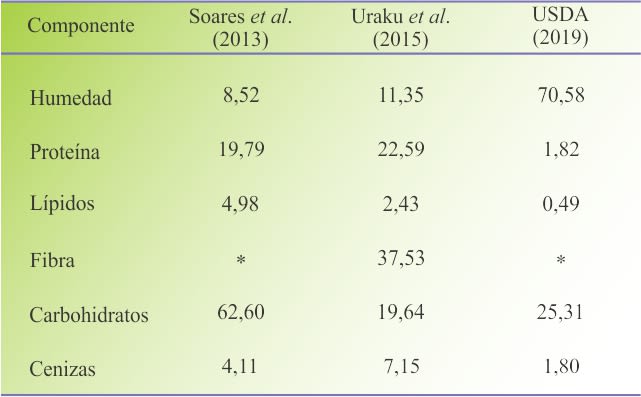 Créditos: Cuadro elaborado en CorelDRAW X8 con información de Soares et al. (2013), Uraku et al. (2015) y USDA (2019). (*) Fibra cruda incluida en la fracción carbohidratos.