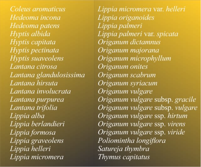 Entre los géneros, Origanum y Lippia son los principales. Para dar mayor claridad de la diversidad de especies conocidas como orégano presento la siguiente lista.