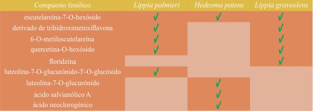 Para la especie Lippia graveolens, en ensayos con el radical DPPH• y la determinación del TPC en extractos metanólicos de las partes aéreas, la capacidad antioxidante se atribuyó al ácido rosmarínico y la naringenina.