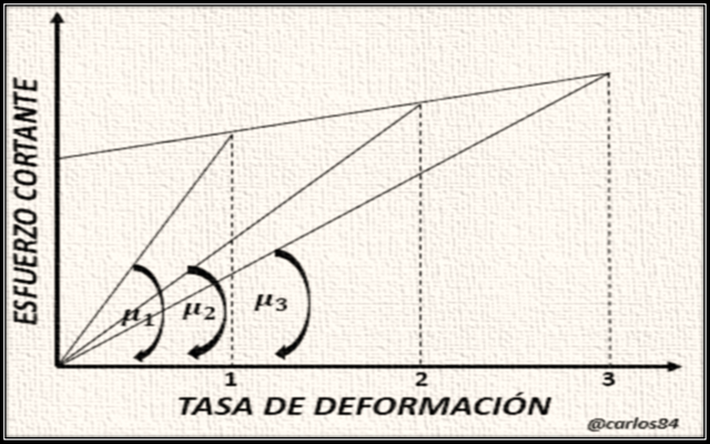 En la figura también se observa que el cociente entre un esfuerzo inicial (tao sub cero) y la tasa de formación (gamma), va formando una proporción decreciente de lo que es una tasa de resistencia total al corte, todo esto ocurre a medida que la tasa de corte aumenta, de modo que la viscosidad efectiva va disminuyendo conforme aumenta la tasa de corte o deformación.