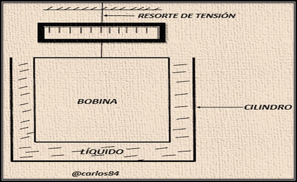 Dentro de los elementos esenciales del viscosímetro, tenemos un cilindro exterior que gira concéntricamente alrededor de un cilindro interior o bobina, la cual está suspendida de un resorte de torsión.