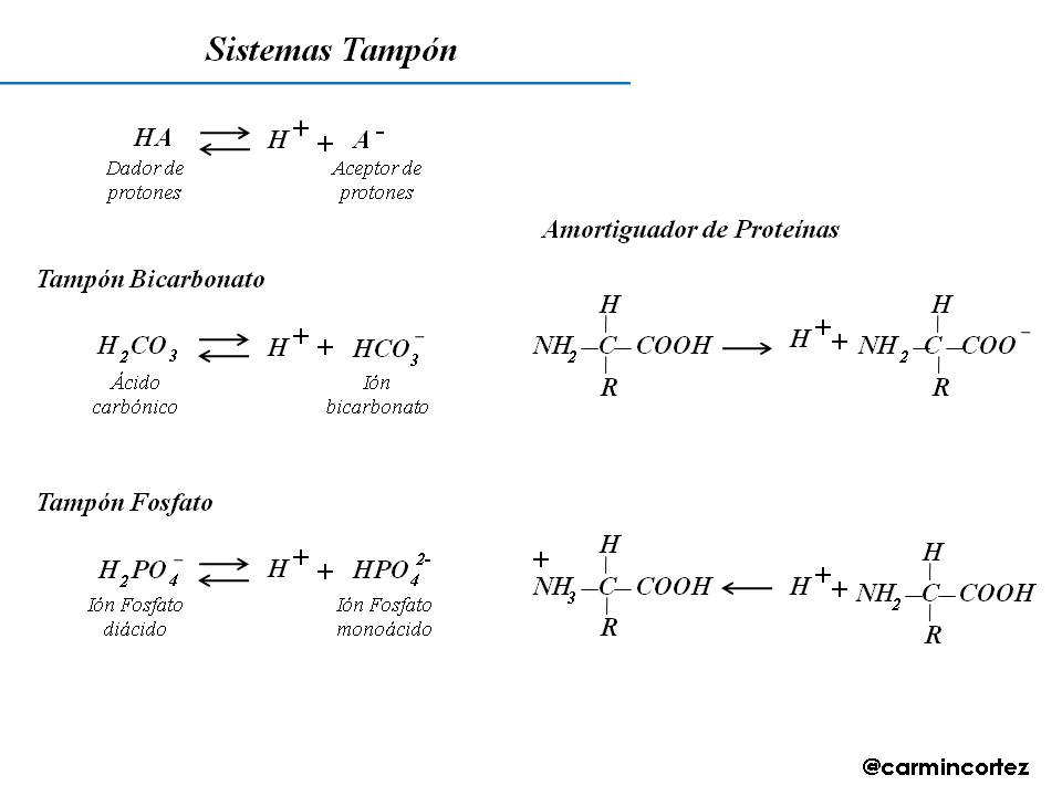 Entre los sistemas tampón con los que cuentan los fluidos corporales, se distinguen: en los líquidos intracelulares el sistema amortiguador de proteínas y el par conjugado Ión Fosfato Diácido – Ión Fosfato Monoácido. Igualmente, proteínas contribuyen al mantenimiento del pH en el plasma sanguíneo, tal como la hemoglobina. Entretanto, el sistema amortiguador por excelencia en los líquidos extracelulares e intersticiales, es el tampón ácido carbónico – bicarbonato. Del mismo modo, este mecanismo se acopla a los procesos de: espiración de dióxido de carbono, la secreción tubular de hidrogeniones y la reabsorción tubular del ion bicarbonato.