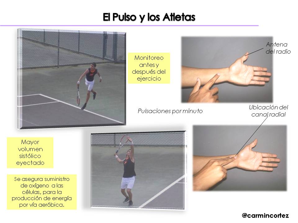 Como se mencionó, el corazón cumple con un ciclo cardíaco y alternancia acompasada de movimientos, lo cual es percibido al colocar la yema de sus dedos en la muñeca, debajo del pulgar (canal radial). Un atleta de competencia, durante su entrenamiento puede lograr eyectar un mayor volumen sistólico por minuto, que una persona promedio. Si se analiza el planteamiento: GC/VS = FC, al impulsar un mayor volumen sistólico, la frecuencia cardíaca disminuye. En consecuencia, al tomarse el pulso antes y después de la actividad física, los latidos por minuto de un atleta entrenado serán menores en comparación a una persona promedio al ejecutar dichas actividades. Del mismo modo, el poder de recuperación de un atleta será más rápido, para ello, se emplean tablas de monitoreo, para que el atleta vea su progreso.