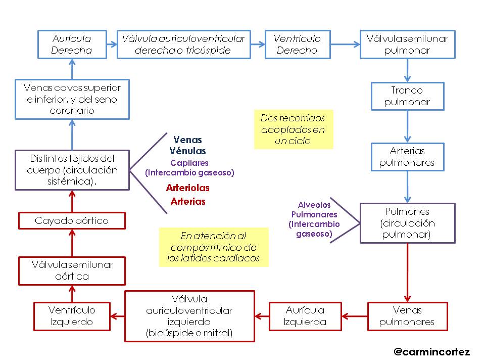 Estos movimientos determinan el recorrido de la sangre por una intricada red de tuberías, de distintos diámetros, dentro de los cuales se distinguen: arterias, arteriolas, capilares, vénulas y venas. De manera ejemplificativa y simplificada, comenzaremos el recorrido desde la recepción de la aurícula derecha de sangre desoxigenada, procedente de las venas cavas superior e inferior, y del seno coronario (diástole auricular). Luego, la aurícula derechase contrae (sístole auricular), la válvula auriculoventricular derecha o tricúspide se abre y permite el paso de la sangre hacia el ventrículo derecho (diástole ventricular).