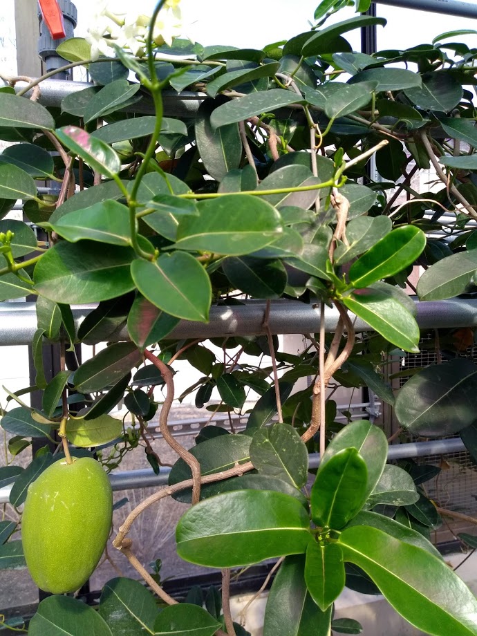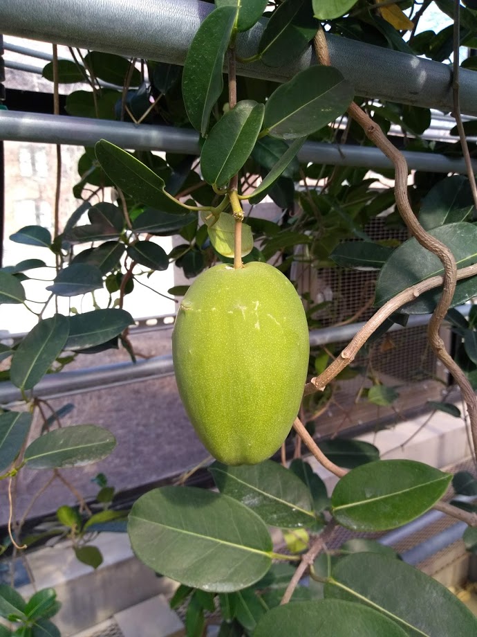 The leaves are evergreen, oval, glossy and leathery. The fruit (seed pod) resembles a mango and can reach about 4 inches in length. Initially green, the pod becomes brown with age and then splits open (not shown) releasing seeds with silky 'parachutes' (not shown, but illustrated in (1)). The plant is a woody climber that can grow to about 20 feet in height; the specimen illustrated here is about 8 feet in height.