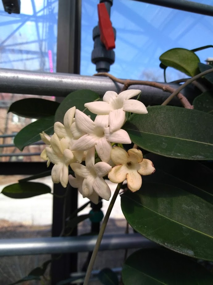 Madagascar jasmine (Stephanotis floribunda) has incredibly fragrant, white, star-shaped, waxy, tubular, trumpet-shaped flowers. It is also known as waxflower, Hawaiian wedding flower, and bridal wreath ... the clusters of flowers are often used as bouquets for new brides (1). The flowers yellow with age. It is a member of the Apocynaceae family of angiosperms and is native to Madagascar (1). This specimen was photographed by myself in the Dept. of Horticulture and Landscape Architecture greenhouse at Purdue University, West Lafayette, IN on February 26, 2019.