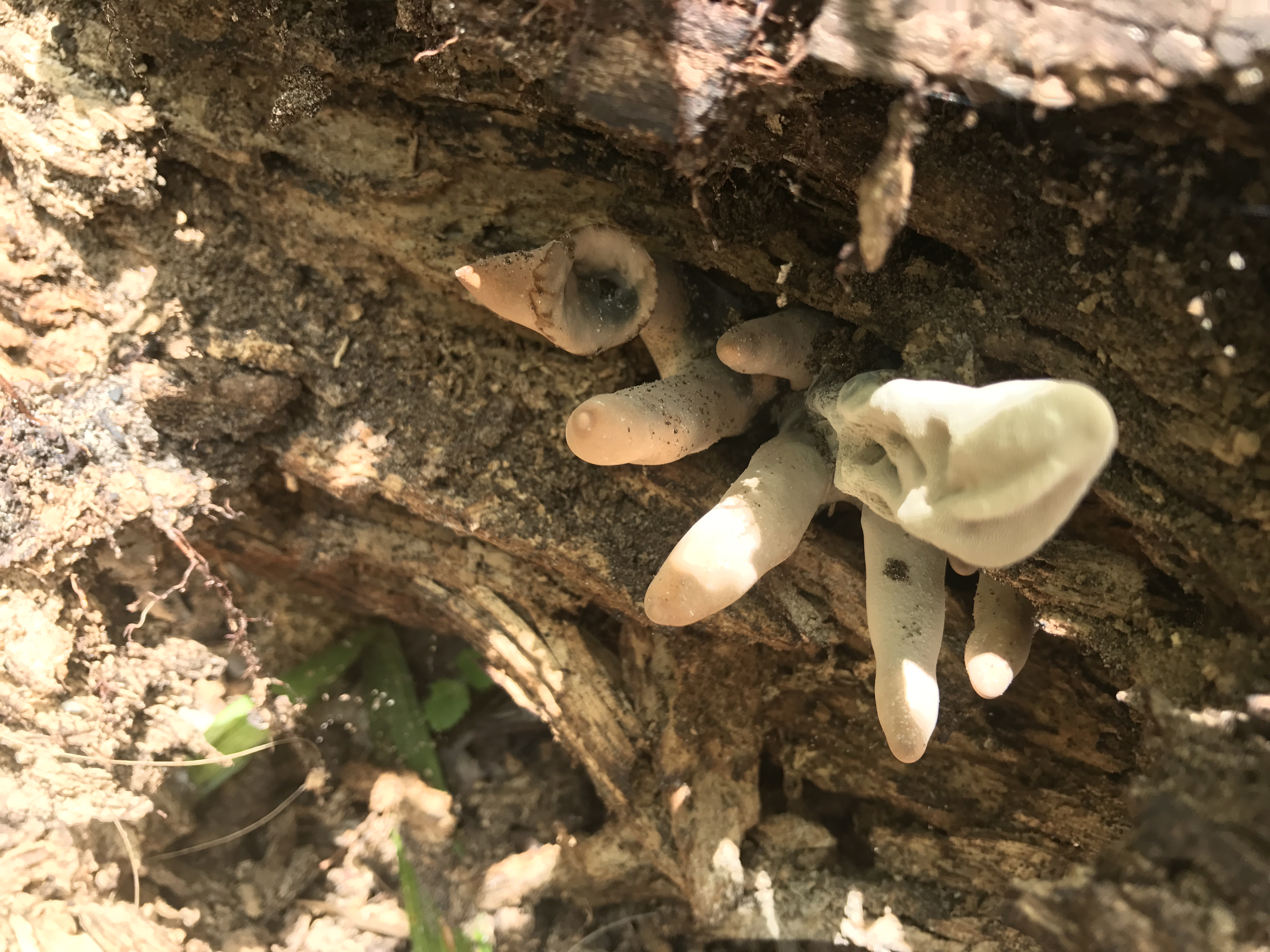 These Cytidia mushrooms, possibly C.flocculenta, are cup looking fungi with a rudimentary wrinkly gill structure at the inside base of their cups.