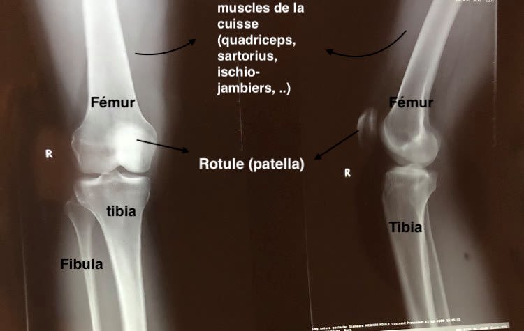 Si dessous, une radiologie personnelle d'un genou. pour vous aider à mieux vous y retrouver j'ai indiqué les différents os visibles.