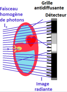 Pour focaliser les rayons, on utilise une grille anti-diffusante. Cela permet d'améliorer la qualité de l'image en filtrant les rayons divergents, et de focaliser ces rayons afin qu'ils n'aillent pas dans tous les sens.