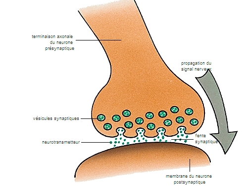 La synapse est en fait l'espace entre 2 neurones. Cet espace est très petit et permet aux neurotransmetteurs de voyager d'un neurone à un autre. Et ainsi transmettre l'influx.