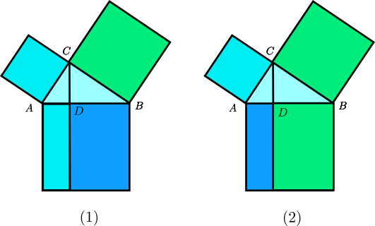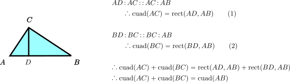 en la que las proporciones se establecen por la semejanza de los tres triángulos rectángulos que se pueden identificar al bajar la altura desde el vértice del ángulo recto. Obsérvese que la primera proporción dice que el segmento AC es media proporcional entre los segmentos AD y AB; geométricamente esto significa (era una demostración temprana para ellos) que el cuadrado construído sobre el segmento AC es igual al rectángulo construído con los segmentos AD y AB. Un razonamiento idéntico permite decir lo mismo de los segmentos BC, BD y AB. Podemos hacer una ilustración gráfica: