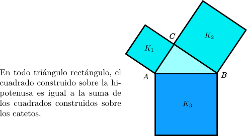 Aludiendo a la figura, el teorema dice que K1+K2=K3, si el triángulo ABC es rectángulo con su ángulo recto en C. Esta suma no debe entenderse en el sentido algebraico con el que la interpretamos hoy, pues los griegos carecían de notación algebraica y del concepto de número real. Una de las traducciones españolas más conocidas de los Elementos de Euclides (María Luisa Puertas Castaño), traduce el enunciado del teorema de Pitágoras (proposición 47 del primer libro) de la siguiente manera: