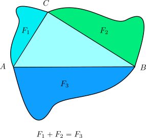 - Hace notar que el teorema es un caso particular de otro del propio Euclides, que aparece en el libro sexto (se trata de la proposición 31). Sin embargo, incluso esta generalización euclidiana se puede llevar aun más lejos, si consideramos un triángulo rectángulo cualquiera, sobre cuyos lados construimos a escala tres figuras semejantes (homotéticas, para ser más precisos). Si las figuras sobre los catetos se denominan F1, F2 y la de la hipotenusa es F3, entonces F1+F2=F3, tal como se muestra en la ilustración que sigue: