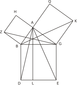 Trácese pues a partir de BG el cuadrado BDEG, y a partir de BA, AG los cuadrados HB, QG, y por el (punto) A trácese AL paralela a una de las dos (rectas) BD, GE; y trácense AD, ZG. Y dado que cada uno de los ángulos BAG, BAH es recto, entonces en una recta cualquiera BA y por un punto de ella, A, las dos rectas AG, AH, no colocadas en el mismo lado, hacen los ángulos adyacentes iguales a dos rectos; por tanto, GA está en línea recta con AH. Por la misma razón, BA también está en línea recta con AQ. Y como el ángulo DBG es igual al (ángulo) ZBA --porque cada uno (de ellos) es recto-- añádase a ambos el (ángulo) ABG; entonces el (ángulo) entero DBA es igual al (ángulo) entero ZBG; y como DB es igual a BG, y ZB a BA, los dos (lados) DB, BA son iguales respectivamente a los dos (lados) ZB, BG; y el ángulo DBA es igual al ángulo ZBG; entonces la base AD es igual a la base ZG, y el triángulo ABD es igual al triángulo ZBG; y el paralelogramo BL es el doble del triángulo ABD: porque tienen la misma base BD y están entre las mismas paralelas BD, AL; pero el cuadrado HB es el doble del triángulo ZBG: porque tienen a su vez la misma base ZB y están entre las mismas paralelas ZB, HG; [pero los dobles de cosas iguales son iguales entre sí]; por tanto, el paralelogramo BL es también igual al cuadrado HB. De manera semejante, trazando las (rectas) AE, BK se demostraría que también el paralelogramo GL es igual al cuadrado QG; por tanto, el cuadrado entero BDEG es igual a los cuadrados HB, QG. Asimismo, el cuadrado BDEG ha sido trazado a partir de BG, y los (cuadrados) HB, QG a partir de BA, AG. Por tanto, el cuadrado del lado BG es igual a los cuadrados de los lados BA, AG.