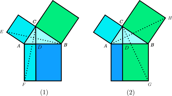 A la izquierda, los triángulos congruentes son EAB y CAF, el primero de los cuales comparte base y altura con el cuadrado sobre el cateto AC y el segundo comparte base y altura con el rectángulo de diagonal DF. Es decir: los triángulos son la mitad de los cuadriláteros correspondientes y, por tanto, ellos son iguales (en área). A la derecha, los triángulos auxiliares son ABH y CBG, lo que da igualdad (de áreas) entre el cuadrado sobre el cateto BC y el rectángulo de diagonal DG. La unión de los rectángulos da el cuadrado sobre la hipotenusa AB.