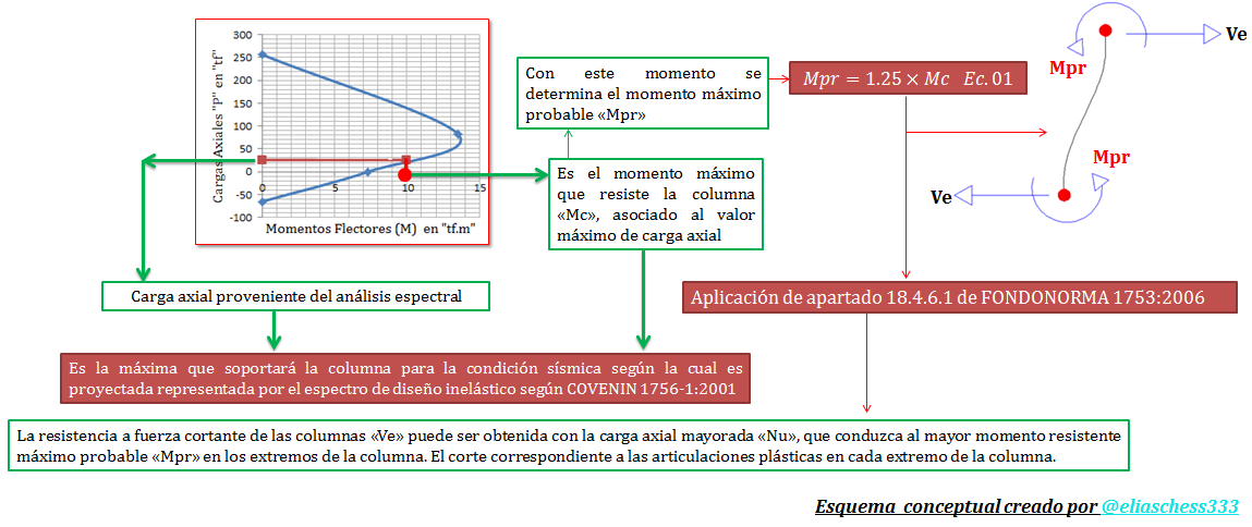 Con esta carga axial “Nu”, se ingresa al diagrama de interacción de la imagen N°02, para aplicar el criterio de la sección 18.4.6.1 de la norma venezolana "FONDONORMA 1753:2006", encaminado en determinar el cortante máximo “Ve” que actuará en la columna. De acuerdo a lo presentado en el video N°01, la carga axial corresponde al valor de “25.92 tf=25920 kgf”. Con esta carga se ingresa en el diagrama de interacción para obtener el momento máximo que puede resistir la columna.