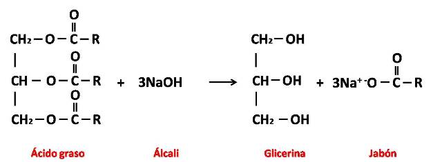 Por eso antes de responder debemos tener claro primeramente que es y cómo funciona el jabón. El jabón por lo general es una sal sódica que resulta de la reacción entre el hidróxido de sodio y un lípido, de origen vegetal o animal, obtenido mediante una reacción conocida como saponificación[1]. Debemos diferenciarlo de los detergentes, ya que estos tienen una composición diferente. La reacción de saponificación entre una grasa y un álcali produce glicerol y jabón como productos, la misma se puede representar de forma general de la manera siguiente: