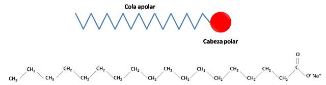 Representación de una molécula de jabón y molécula de estearato de sodió. Fuente: @emiliomoron.