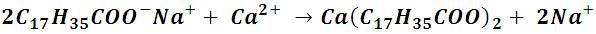 Debido a que la cabeza hidrófila de la molécula de jabón presenta polaridad, interactúa muy bien con los iones Ca+ y Mg+ presentes en el agua. Consideremos la molécula de estearato de sodio, esta sal sódica al disolverse en el agua perderá su ion de sodio si el ion estearato encuentra un ion con el cual pueda formar un enlace más fuerte, como el ion de calcio o magnesio, formando un compuesto insoluble que se precipita fuera de la solución y que resulta fácil de enjuagar.
