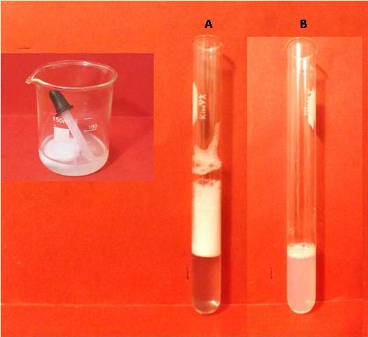Si preparamos una solución disolviendo un poco de jabón, y agregamos 10 gotas de esta en aproximadamente 10 mL de agua recolectada del aire acondicionado y agitamos, notaremos la cantidad de espuma que se forma. Si repetimos el procedimiento con agua del grifo observaremos que claramente la cantidad de espuma es mucho menor, incluso el agua se mantiene turbia por más tiempo. Esto demuestra la interacción de las moléculas de estearato con los iones metálicos presentes en el agua del grifo.