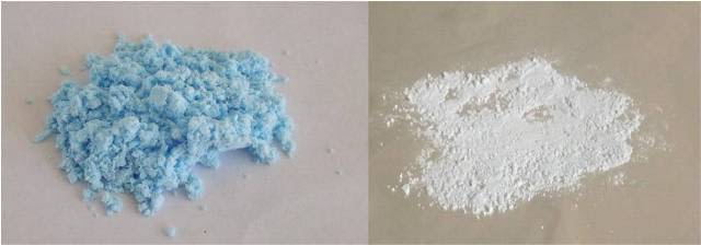 Image of cupric sulfate pentahydrate (left) and anhydrous cupric sulfate (right). Own image.