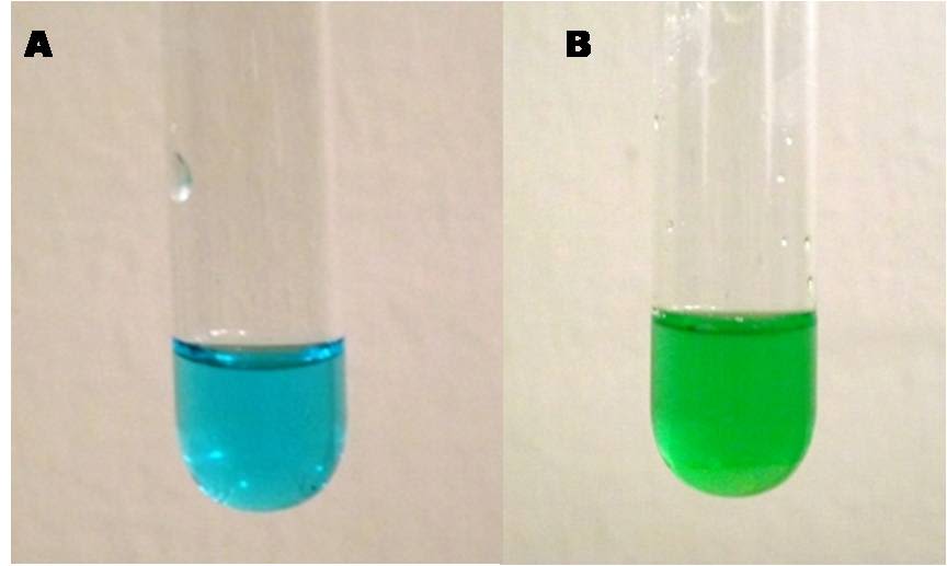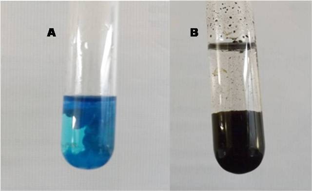 Image of the precipitates of: copper hydroxide (A) and copper oxide (B). Own source.