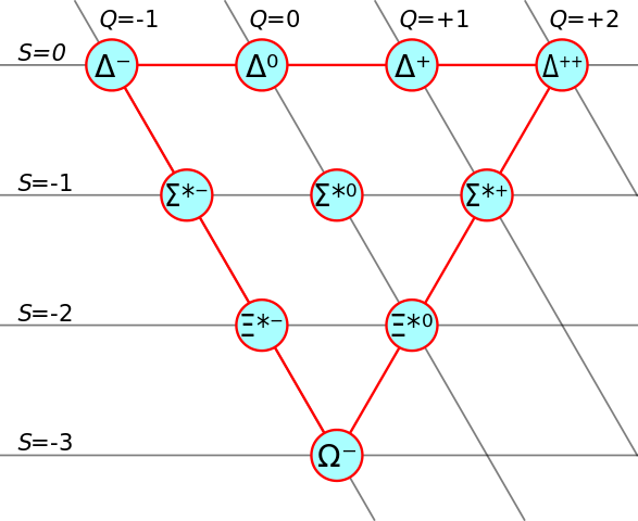 The fundamental ‘charge’ or property called strangeness, symbol S, was needed to explain this behaviour. Particles can have strangeness numbers from +3 to -3. This introduces the idea of ‘threeness, which will be explained below.
