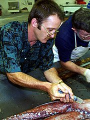Injecting a giant squid specimen with formalin for preservation. Gene Carl Feldman, Public Domain